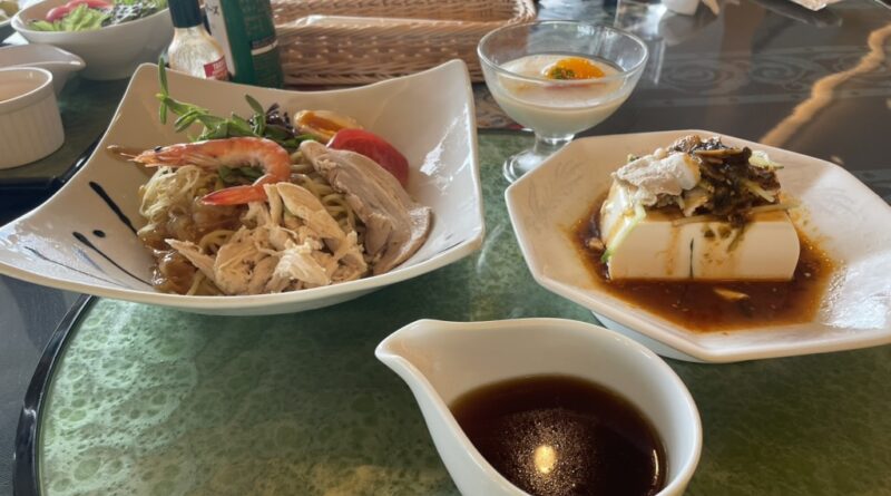 お昼は冷やし中華。セットで冷奴とかデザートも付いていて嬉しかったです💕